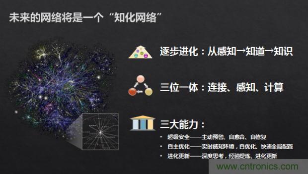 “它”將是一個(gè)“知化”網(wǎng)絡(luò),它將逐步進(jìn)化,從現(xiàn)在這種冰冷的物理連接到主動(dòng)感知各類連接設(shè)備,再到分析了解網(wǎng)絡(luò)運(yùn)行的各種數(shù)據(jù),知曉如何適應(yīng)外界的變化,最后網(wǎng)絡(luò)將有智能思考的能力,形成自身的知識(shí),會(huì)進(jìn)行策略選擇和推演,實(shí)現(xiàn)人、網(wǎng)絡(luò)和應(yīng)用的融合一體。 未來這個(gè)“知化”的網(wǎng)絡(luò)將是集連接、感知、計(jì)算和數(shù)據(jù)服務(wù)為一體的網(wǎng)絡(luò),將會(huì)實(shí)現(xiàn)超級(jí)安全、自主優(yōu)化、進(jìn)化更新等三大能力。