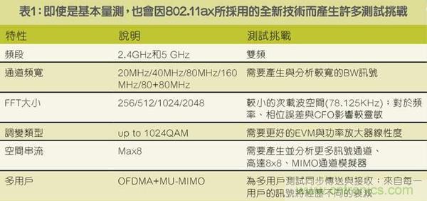 表1:即使是基本量測(cè),也會(huì)因802.11ax所采用的全新技術(shù)而產(chǎn)生許多測(cè)試挑戰(zhàn)
