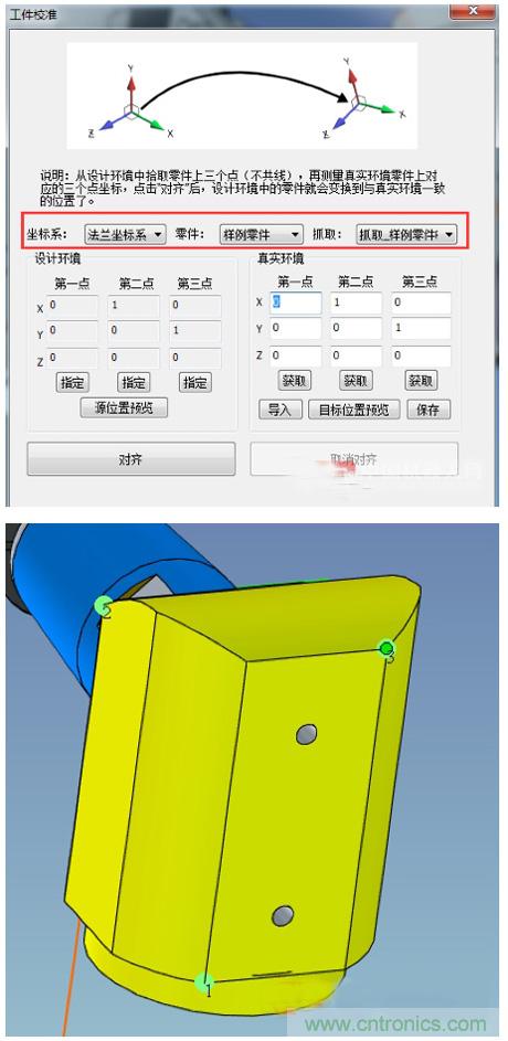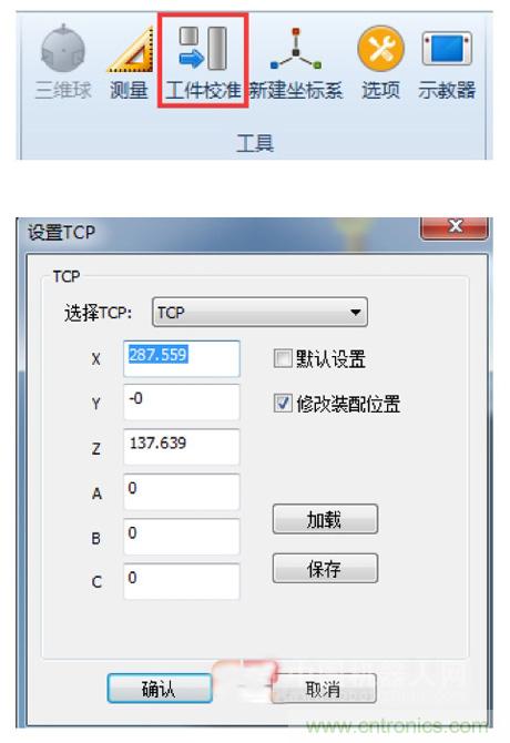 然后,我們對零件的三維模型進行工件校準以及對工具的TCP進行設(shè)置,完成此步驟后零件和工具的位置就已經(jīng)和實際的位置保持一致了。