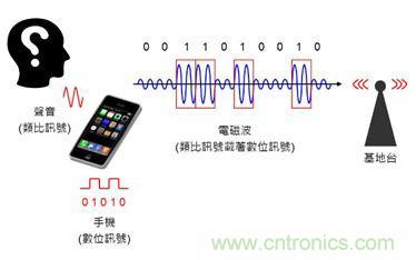 現(xiàn)在的手機(jī)是屬于「數(shù)字通信」,也就是我們講話的聲音(連續(xù)的模擬信號),先由手機(jī)轉(zhuǎn)換成不連續(xù)的 0 與 1 兩種數(shù)字信號,再經(jīng)由數(shù)字調(diào)變轉(zhuǎn)換成電磁波(模擬信號載著數(shù)字信號),最后從天線傳送出去,原理如圖一所示。