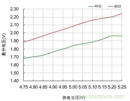 差分電壓除負(fù)載電阻的影響外,還會(huì)受到供電電壓的影響,如圖 2我們測(cè)試了CTM1051M模塊在不同電壓,不同負(fù)載下的差分電壓幅值,可以看到電源電壓升高0.5V,差分電壓幅值會(huì)升高約0.3V。