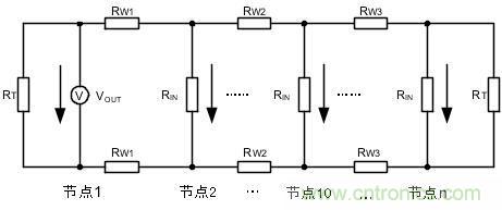 圖 4中,各節(jié)點(diǎn)的RW、RIN難以準(zhǔn)確確定,組網(wǎng)時(shí)以公式計(jì)算較為繁瑣,簡便的方法便是測(cè)量總線兩端的節(jié)點(diǎn)電壓。如網(wǎng)絡(luò)的總線電阻過大時(shí),節(jié)點(diǎn)1到節(jié)點(diǎn)n總線對(duì)信號(hào)的損耗會(huì)很大,當(dāng)節(jié)點(diǎn)n接收的差分電壓低于1.2V時(shí),需要增大終端電阻。