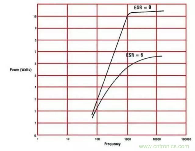 下圖是兩個(gè)100微法電容(ESR分別為0和6歐姆)時(shí)其輸出功率隨輸出頻率變化的曲線。