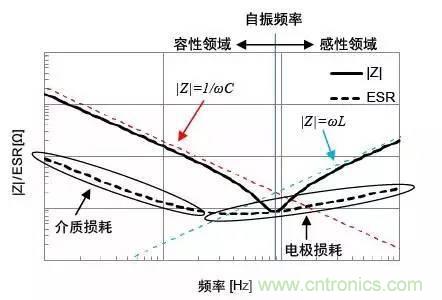 圖 實(shí)際電容器的|Z|/ESR頻率特性(例)