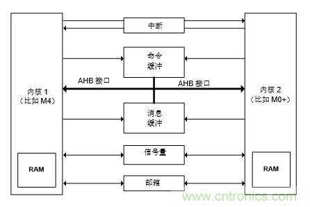 消息隊(duì)列:消息隊(duì)列使用共享內(nèi)存的兩個(gè)區(qū)域來存儲(chǔ)每個(gè)核心發(fā)送給另一個(gè)核心的消息。第一個(gè)區(qū)域是被稱為命令緩沖器的專用存儲(chǔ)器,用于存儲(chǔ)從主機(jī)發(fā)送到從機(jī)的命令。另一個(gè)專用存儲(chǔ)器被稱為消息緩沖器,它使從機(jī)能夠響應(yīng)主機(jī)。
