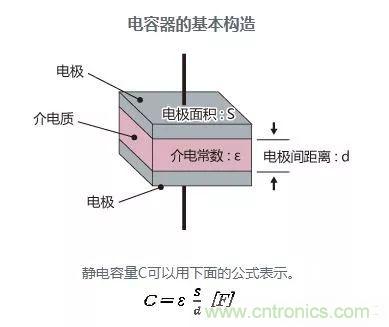 普通電容器由2枚電極(金屬板)和中間夾著的介電質(zhì)組成。一旦施加電壓,電子就聚集在一個電極上,是儲存電荷的狀態(tài)。此時電極間的介電質(zhì)通過「介電分極」現(xiàn)象,發(fā)揮增加靜電容量的作用。