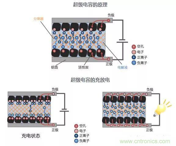超級電容通過電極和電解液儲存電氣的構(gòu)造與普通電池一樣。但是電池是利用電極和電解液間發(fā)生的化學(xué)反應(yīng)(電極直接發(fā)生化學(xué)反應(yīng)并溶解),而超級電容僅是通過電子在電極間的移動。根據(jù)此不同點顯示出兩者不同的性質(zhì)。舉一個相對于電池,超級電容的優(yōu)勢。因為充放電時,僅通過電子移動,所以電極劣化小,與普通電池相比,可更多地進(jìn)行充放電(村田的超級電容可使用10萬次以上)。