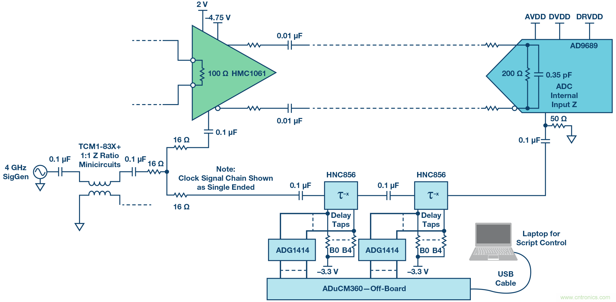 在電路板上完成該過程可能冗長乏味,因?yàn)榧埫娣治隹赡懿粫?huì)考慮PCB板上時(shí)鐘走線傳播間隔造成的相應(yīng)延遲,內(nèi)部器件組延遲,ADC孔徑延遲,以及將時(shí)鐘分為兩個(gè)不同段所涉及到的相關(guān)電路(一條時(shí)鐘走線用于THA,另一條時(shí)鐘走線用于ADC)。設(shè)置THA和ADC之間延遲的一種方法是使用可變延遲線。這些器件可以是有源或無源的,目的是正確對(duì)準(zhǔn)THA采樣過程的時(shí)間并將其交給ADC進(jìn)行采樣。這保證了ADC對(duì)THA輸出波形的穩(wěn)定保持模式部分進(jìn)行采樣,從而準(zhǔn)確表示輸入信號(hào)。