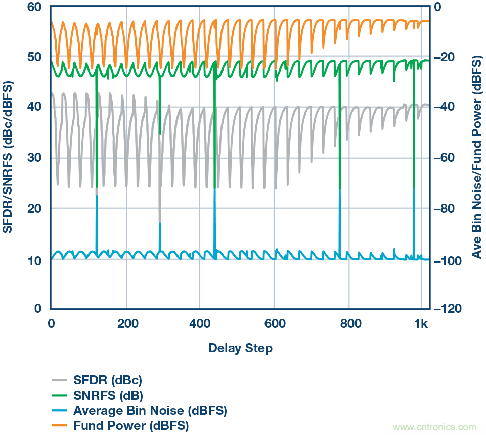 為了獲得最佳延遲設(shè)置,將一個(gè)信號(hào)施加于THA和ADC組合,該信號(hào)應(yīng)在ADC帶寬范圍之外。本例中,我們選擇一個(gè)約10 GHz的信號(hào),并施加-6 dBFS的電平(在FFT顯示屏上捕獲)。延遲設(shè)置現(xiàn)在以二 進(jìn)制步進(jìn)方式掃描,信號(hào)的電平和頻率保持恒定。在掃描過程中顯示并捕獲FFT,收集每個(gè)延遲設(shè)置對(duì)應(yīng)的基波功率和無雜散動(dòng)態(tài)范圍 (SFDR) 數(shù)值。