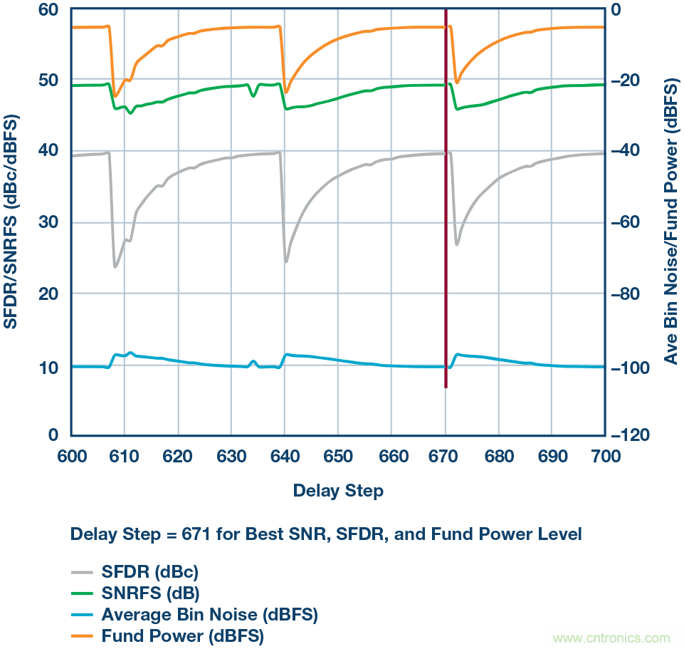 結(jié)果如圖3a所示,基波功率、SFDR和SNR將隨所應(yīng)用的每個(gè)設(shè)置而變化。如圖所示,當(dāng)把采樣位置放在更好的地方(THA將樣本送至ADC的過程之中)時(shí),基波功率將處于最高水平,而SFDR應(yīng)處于最佳性能(即最低)。圖3b為延遲映射掃描的放大視圖,延遲設(shè)定點(diǎn)為671,即延遲應(yīng)該保持固定于此窗口/位置。請(qǐng)記住,延遲映射程序僅對(duì)系統(tǒng)的相關(guān)采樣頻率有效,如果設(shè)計(jì)需要不同的采樣時(shí)鐘,則需要重新掃描。本例中,采樣頻率為4 GHz,這是該信號(hào)鏈中使用的THA器件的最高采樣頻率。