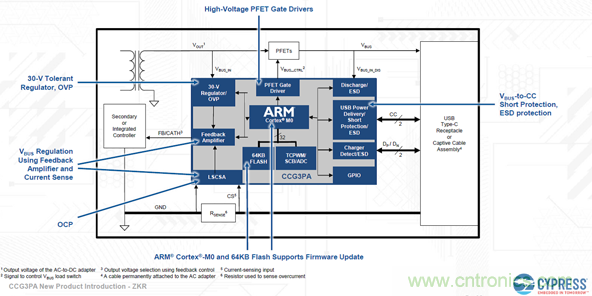 CCG3PA采用24引腳QFN或16引腳SOIC封裝,是一款適用于符合USB PD 3.0 標(biāo)準(zhǔn)的USB-C上的緊湊型系統(tǒng)級(jí)芯片,只需添加外部MOSFET和AC-DC轉(zhuǎn)換器即可成為一個(gè)符合最新USB供電標(biāo)準(zhǔn)的完整離線(xiàn)電源適配器/充電器。