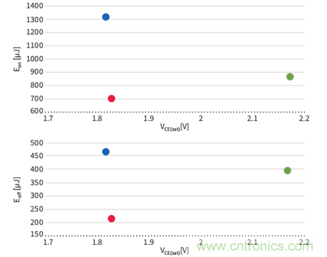 600/650V IGBT 飽和壓降(VCE(sat) ) vs開通損耗(Eon ) & 關(guān)斷損耗(Eoff)比較測(cè)試條件: TC = 150°C, IC = 15 A, Rg = 25, VGE = 15 V。
