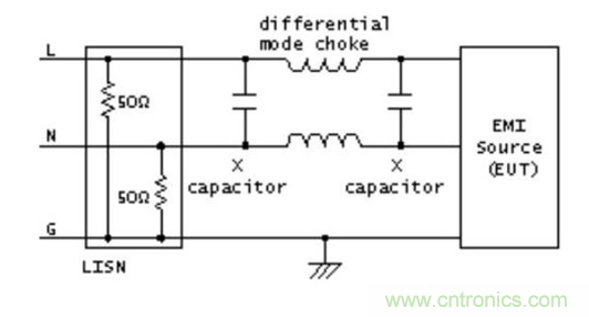 電容的作用是將高頻干擾電壓“短路”,另外,當(dāng)干擾信號(hào)頻率很高時(shí),抑制線(xiàn)圈將產(chǎn)生很大的交流阻抗。圖2顯示了兩種濾波類(lèi)型的結(jié)構(gòu),其中,LISN是用于測(cè)量目的的線(xiàn)性阻抗穩(wěn)定網(wǎng)絡(luò)。如果是共模問(wèn)題引起的干擾,X類(lèi)型電容基本上沒(méi)有作用,因?yàn)閮删€(xiàn)上的干擾電壓是一樣的。因此,了解干擾類(lèi)型對(duì)于選擇合理的電路結(jié)構(gòu)將起重要作用,并為解決問(wèn)題提供技術(shù)依據(jù)。