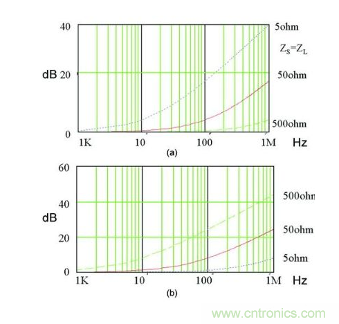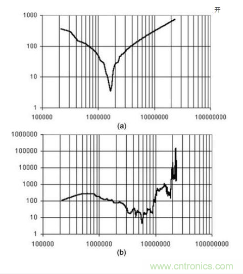 上面的例子說(shuō)明,選擇一個(gè)具有很高插損的濾波器也不能很好抑制傳導(dǎo)噪聲的原因是,電源輸入端阻抗的影響。因此,設(shè)計(jì)者除了選擇一個(gè)合適的濾波器之外,還需要了解電源的阻抗特性、共模阻抗和差模阻抗。阻抗測(cè)試可以借助專(zhuān)用的阻抗測(cè)試儀或者傳導(dǎo)分析儀。一種濾波器的共模阻抗(a)和差模阻抗(b)的變化如圖5所示。
