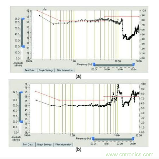 在標(biāo)準(zhǔn)電磁兼容性測(cè)試實(shí)驗(yàn)室可得到設(shè)備的總干擾情況,但無(wú)法了解設(shè)備的共模干擾和差模干擾特性。為了在測(cè)量中分辨共?;蛘卟钅8蓴_信號(hào),通用的儀器是很難實(shí)現(xiàn)的。使用專(zhuān)用的傳導(dǎo)測(cè)試儀,可獲得設(shè)備的總干擾、共模干擾和差模干擾。測(cè)試結(jié)果如圖3所示。