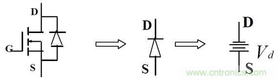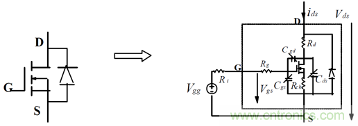 實(shí)際的功率MOSFET 可用三個(gè)結(jié)電容,三個(gè)溝道電阻,和一個(gè)內(nèi)部二極管及一個(gè)理想MOSFET 來(lái)等效。三個(gè)結(jié)電容均與結(jié)電壓的大小有關(guān),而門(mén)極的溝道電阻一般很小,漏極和源極的兩個(gè)溝道電阻之和即為MOSFET 飽和時(shí)的通態(tài)電阻。