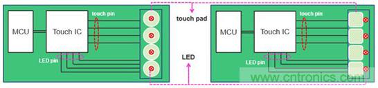 從LED驅(qū)動(dòng)的角度,比較二者的異同。通常,觸控 IC內(nèi)置了LED Driver。如果應(yīng)用方案中需要使用LED表示觸控動(dòng)作的有/無(wú),并且應(yīng)用產(chǎn)品的結(jié)構(gòu)設(shè)計(jì),要求LED緊鄰觸控電極,如圖5所示,那么使用觸控 IC更方便PCB的Layout。