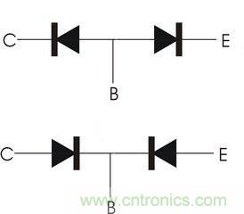 2.發(fā)射結(jié)和集電結(jié)都是屬于pn結(jié),具備pn結(jié)的特性,因此其結(jié)構(gòu)相當(dāng)于一個(gè)極(陰極和陰極或者陽(yáng)極和陽(yáng)極)并聯(lián)在一起的兩個(gè)二極管,這個(gè)公共的電極就是基極,而另外兩個(gè)極就是集電極和發(fā)射極;見(jiàn)圖二,上面的對(duì)應(yīng)的是npn型三極管,下面的對(duì)應(yīng)的是pnp型三極管;