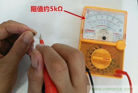 2.然后用拇指和食指捏住基極和另一個(gè)腳(假定該腳為集電極),方法同上,記錄顯示值R2;