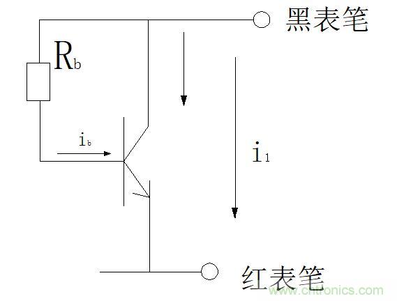 第二步測(cè)量原理圖如下:圖八所示Rb相當(dāng)于手指,它就是一個(gè)偏置電阻,三極管接法正確時(shí),基極施加了偏流,這時(shí)的集電極電流I1較大,相當(dāng)于萬(wàn)用表阻值較小,它所對(duì)應(yīng)的正好是上圖六;