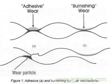 在(b)處較弱的界面可能在原始界面處或附近斷裂,很少發(fā)生磨損。(a)處的磨損過程通常稱為粘著磨損,(b)處的磨損過程稱為拋光磨損。如果在放大鏡下觀察連接器咬合過程中產(chǎn)生的磨損軌跡,在30~50倍放大時,粘著磨損軌跡將顯示出磨損顆粒的跡象,并顯得有些粗糙,而拋光磨損軌跡將顯得光滑和光亮。