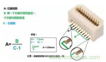 請注意,在這個例子中,同一排相鄰引腳間距的測量和兩排之間引腳間距是不一樣的。同一排相鄰引腳間距的測量和兩排之間引腳間距可以相同,所以連接器一定要仔細檢查這兩個參數。