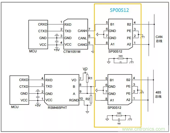 另一種方案則是采用ZLG的SP00S12浪涌保護(hù)模塊,可用于各種信號(hào)傳輸系統(tǒng),抑制雷擊、浪涌、過(guò)壓等有害信號(hào),對(duì)設(shè)備信號(hào)端口進(jìn)行保護(hù)。搭配ZLG的全隔離CTM或SC系列的隔離CAN收發(fā)器,如下圖??蓸O大程度的提升產(chǎn)品的集成度,于此同時(shí)極大程度的縮小開(kāi)發(fā)周期。