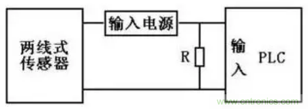 傳感器的種類很多,其輸出方式也各不相同。當(dāng)采用接近開關(guān)、光電開關(guān)等兩線式傳感器時(shí),由于傳感器的漏電流較大,可能出現(xiàn)錯(cuò)誤的輸入信號(hào)而導(dǎo)致PLC的誤動(dòng)作,此時(shí)可在PLC輸入端并聯(lián)旁路電阻R,如圖3所示。當(dāng)漏電流不足lmA時(shí)可以不考慮其影響。