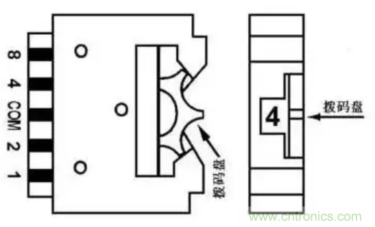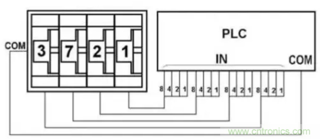 如果PLC控制系統(tǒng)中的某些數(shù)據(jù)需要經(jīng)常修改,可使用多位撥碼開關(guān)與PLC連接,在PLC外部進(jìn)行數(shù)據(jù)設(shè)定。如圖4所示,為一位撥碼開關(guān)的示意圖,一位撥碼開關(guān)能輸入一位十進(jìn)制數(shù)的0~9,或一位十六進(jìn)制數(shù)的0~F。