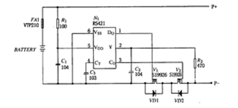 鋰離子電池保護(hù)電路包括過(guò)度充電保護(hù)、過(guò)電流/ 短路保護(hù)和過(guò)放電保護(hù)等,該電路就是要確保這樣的過(guò)度充電及放電狀態(tài)時(shí)的安全,并防止特性劣化。它主要由集成保護(hù)電路IC、貼片電阻、貼片電容、場(chǎng)效應(yīng)管(MOSFET) 、有的還有熱敏電阻(NTC) 、識(shí)別電阻( ID) 、保險(xiǎn)絲( FUSE) 等構(gòu)成。其電路圖如圖1所示。