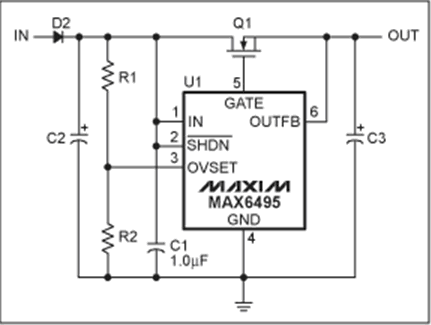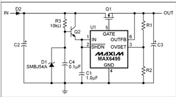 過(guò)壓保護(hù)(OVP)器件數(shù)據(jù)資料中提供的典型電路可以滿足大多數(shù)應(yīng)用的需求(圖1)。然而,有些應(yīng)用需要對(duì)基本電路進(jìn)行適當(dāng)修改。本文討論了兩種類似應(yīng)用:增大電路的最大輸入電壓,在過(guò)壓情況發(fā)生時(shí)利用輸出電容存儲(chǔ)能量。