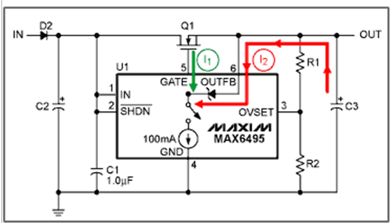 MAX6495–MAX6499/MAX6397/MAX6398通過(guò)內(nèi)部100mA的電流源(見(jiàn)圖4)連接到GATE輸出,以對(duì)柵極電容和輸出電容放電。電流源先對(duì)GATE放電(電流I1,綠色箭頭),直到GATE的電壓等于OUTFB電壓,然后斷開(kāi)FET,電流源繼續(xù)降低GATE電壓,最后,直到內(nèi)部的箝位二極管變?yōu)檎蚱?,?duì)輸出電容放電(電流I2,紅色箭頭)。