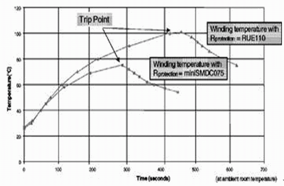 選擇PPTC元件時(shí),需要考慮可以通過的最大負(fù)荷電流、最高的環(huán)境溫度(通常為45℃)以及由變壓器溫度上升速率所決定的的最大動(dòng)作時(shí)間。