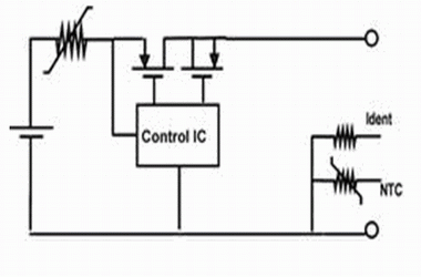 鋰離子電池盒一般包括有源過壓及過電流檢測安全電路(IC和MOEFET),以及串聯(lián)聚合物PTC組件,如圖5所示。若PPTC組件有低溫操作特性,在電池溫持續(xù)升高的情況下,它將以切斷充電或放電來提供過溫度保護(hù)。雖然半導(dǎo)體電路很可靠,在某些情況下故障也可能發(fā)生,例如靜電過度放電,高溫或在短路情況下的震動(dòng)等。