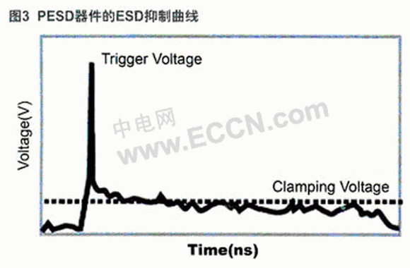 為滿足高速數(shù)據(jù)通訊接口既ESD保護(hù)有效、又不影響高速信號(hào)傳輸?shù)囊?。近年來,市場上推出了多種專門適用于此類保護(hù)要求的器件。其中以瑞侃電路保護(hù)部門(RCP:RaychemCircuit Protection)推出的PESD器件為代表。該器件的電容極低(通常0.25pF),漏電流極小(<0.001 A);ESD防護(hù)快速有效(響應(yīng)曲線如圖3所示,觸發(fā)電壓典型值為150~250V;響應(yīng)時(shí)間少于1 ns);價(jià)格低于低電容硅器件。因此,在高速數(shù)據(jù)傳輸條件下,PESD器件擁有更佳的保護(hù)應(yīng)用特性。該器件已成功應(yīng)用于HDMI1.3和USB2.0等多種高速接口電路。