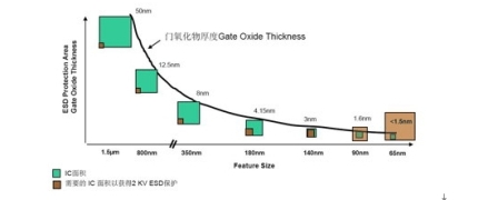 圖4 隨著IC面積的不斷減小,很難在IC中集成ESD保護(hù)電路(資料來源:安森美半導(dǎo)體)