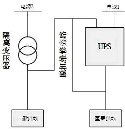 方案在市電電源2的后端設(shè)置隔離變壓器,輸入端采△型接法,不引入中線,輸出端采用Y型接法。實(shí)現(xiàn)輸入與輸出的中性線隔離,減少干擾。