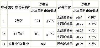 因此,在選擇UPS的同時(shí),必需考慮相應(yīng)的功率因數(shù)及諧波改善措施。目前的主流的UPS的改善主要包括移相、無(wú)源濾波器、有源濾波器、混合式濾波幾種方案。其中移相是指在6脈沖整流器基礎(chǔ)上,增加一個(gè)移相變壓器后再增加一個(gè)6脈沖整流器,可以抑制諧波。機(jī)種諧波改善情況如下表所示: