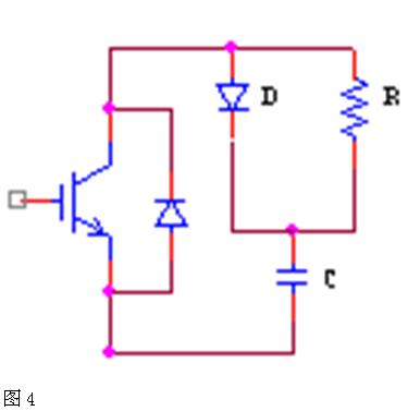 為了使IGBT關(guān)斷過電壓能得到有效的抑制并減少關(guān)斷損耗,需要給IGBT主電路設(shè)置關(guān)斷緩沖吸收電路。IGBT的關(guān)斷緩沖吸收電路分為充放電型和放電阻止型,從吸收過電壓的能力上來說,充放電型效果較好,所以可在弧焊逆變電源中的IGBT過壓保護(hù)緩沖電路可采用圖4所示緩沖吸收電路: