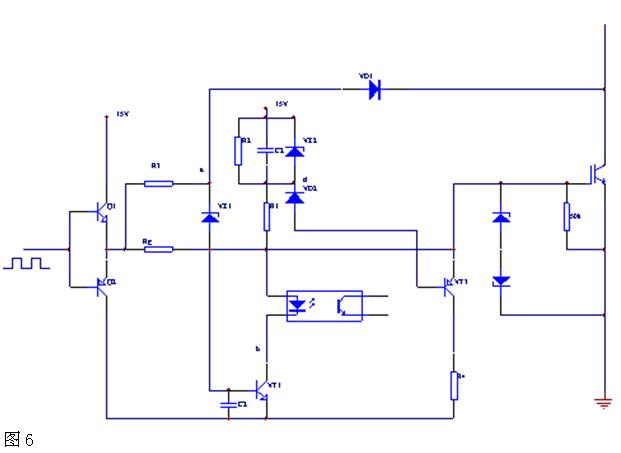 應(yīng)設(shè)計(jì)保護(hù)電路為立即保護(hù)型。即保護(hù)電路動(dòng)作后,切斷供電電源,停止逆變電源工作;最后,對(duì)元器件并沒有失效,而是由于某種其它原因如負(fù)載突然加大造成的過流,可嘗試采用一種慢降柵壓的電路來實(shí)現(xiàn)如圖6: