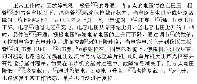 這與傳統(tǒng)的簡(jiǎn)單限流或直接關(guān)閉IGBT的控制方式有本質(zhì)的區(qū)別,它是利用單片機(jī)的智能性改變其工作方式來保護(hù)IGBT的安全,從而可靠的保證IGBT的安全。