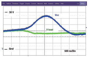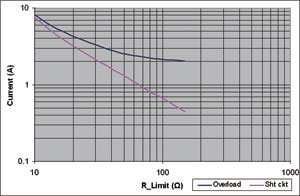 圖2展示NIS5132的一對(duì)曲線(xiàn)。導(dǎo)通較低的曲線(xiàn)時(shí),激活的是短路曲線(xiàn)。一旦電流降低至低于這個(gè)電平,F(xiàn)ET就完全導(dǎo)通(線(xiàn)性區(qū)域),接下來(lái)面對(duì)的就是過(guò)載電平。如果電流達(dá)到過(guò)載電平,F(xiàn)ET的柵驅(qū)動(dòng)將立即減小,而漏極至源極電壓將增加,并會(huì)將工作模式改為短路電平模式。這器件在過(guò)載電平時(shí)不能維持穩(wěn)態(tài)工作。