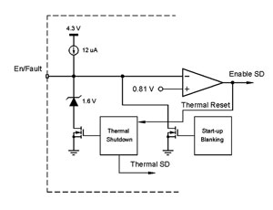 啟用電路使用戶(hù)能夠控制器件,并在發(fā)生熱關(guān)閉時(shí)提供信號(hào)。這是一種三態(tài)信號(hào),同時(shí)發(fā)送及接收信息,能夠監(jiān)測(cè)這信號(hào)以檢測(cè)芯片的狀態(tài)。如果用戶(hù)選擇不用這個(gè)引腳,它只需保留在開(kāi)路狀態(tài),器件會(huì)自己控制。