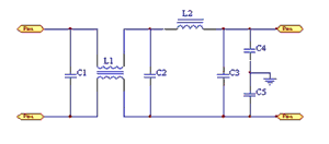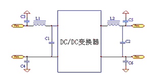為了抑制外來的高頻干擾,也為了抑制DC/DC變換器對外傳導(dǎo)干擾,通過在DC/DC變換器的輸入端、輸出端設(shè)計濾波電路,抑制共模、差模干擾,降低EMI電平。其中,C1、C2、C3為差模濾波電容,C4、C5為共模濾波電容,L1為共模扼流圈,L2為差模濾波電感。