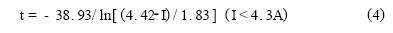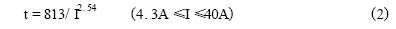 由表1可知,RXE系列PolySwitch元件所能承受的最大電流為40A。該點(diǎn)與臨界點(diǎn)之間為曲線的直線部分。設(shè)動作時間為t(秒),故障電流為I(安),考慮到橫軸、縱軸均為對數(shù)坐標(biāo),兩者之間應(yīng)具有如下數(shù)學(xué)關(guān)系: