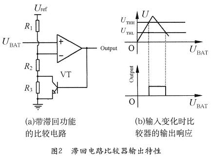 但如果在比較電路中設(shè)置兩個門限電壓:UTHH和UTHL(UTHH>UTHL),則可以形成一個滯回區(qū),如圖1(b)所示。當(dāng)電池電壓從低升高至UTHH時(shí),比較器輸出高電平,打開電子開關(guān),給負(fù)載供電;當(dāng)電池電壓降低至UTHL時(shí),比較器輸出低電平,斷開負(fù)載。這個時(shí)候電池端電壓雖然會迅速升高至UTHL以上,但由于達(dá)不到UTHH,所以,比較器仍然輸出低電平,負(fù)載仍被斷開,直到電池被充電后電壓升高至UTHH以上才能再次接通負(fù)載。這樣就避免了電路的振蕩,保護(hù)了負(fù)載和電池。