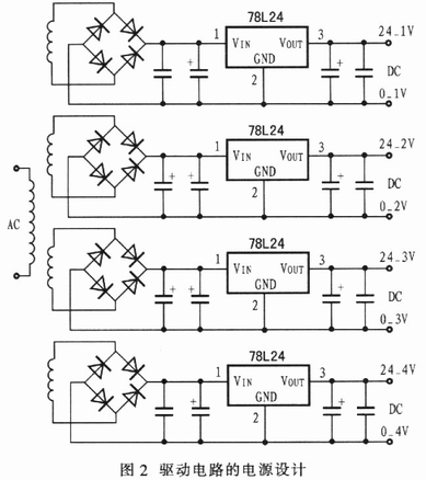 驅(qū)動(dòng)電路需要4路相互隔離的直流電源為4路IGBT驅(qū)動(dòng)電路供電,用220V/22V變壓器對4路交流電源分別整流,用電容器和78L24型電壓調(diào)整器穩(wěn)壓后輸出4路24V直流電壓,如圖2所示。