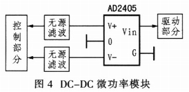 控制電路為弱電部分,極易受到干擾;驅(qū)動(dòng)電路直接與外電路連接,是一個(gè)較強(qiáng)的干擾源;為了實(shí)現(xiàn)整個(gè)設(shè)備的電磁兼容,控制電路部分必須與驅(qū)動(dòng)部分隔離。為了避免公共電源對控制電路產(chǎn)生干擾,應(yīng)對控制電路及驅(qū)動(dòng)電路分別供電,EXB84l的電源電壓為+20V,一般控制電路的供電電壓為5V,因此,可以利用圖4所示的DC-DC微功率模塊進(jìn)行電源隔離,采用A2405D型微功率模塊實(shí)現(xiàn)電源的隔離。