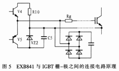 圖5所示為EXB841與IGBT柵-射極之間的連接電路原理圖。當(dāng)驅(qū)動(dòng)電路中的V4導(dǎo)通時(shí),IGBT處于正常導(dǎo)通狀態(tài),當(dāng)V5導(dǎo)通時(shí),IGBT柵-射極之間通過穩(wěn)壓管VZ2提供一個(gè)-5V電壓加在其兩端,使IGBT關(guān)斷,此時(shí)V5處于臨界導(dǎo)通狀態(tài),穩(wěn)壓管VZ2處于反向偏置狀態(tài)。但由于集-柵極之間分布電容的影響,集-柵極之間的du/dt增大時(shí),其通過分布電容形成的電流經(jīng)過,所以,要克服集-柵極之間的du/dt,確保穩(wěn)壓管不過壓,避免IGBT誤導(dǎo)通。克服du/dt的方法有二種:一是驅(qū)動(dòng)電路輸出與IGBT柵-射極之間的連線采用雙絞屏蔽電纜,屏蔽層接地,二是采用快速吸收電路吸收過電壓。