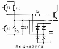在實(shí)際應(yīng)用中,僅靠EXB841的6引腳檢測IG-BT集電極電壓來實(shí)現(xiàn)過流保護(hù)并不足以有效地保護(hù)IGBT,因此有必要在主電路中加接霍爾電流傳感器來檢測電路中的過流,如圖6所示。過流發(fā)生后,檢測電路檢測到電流,延時(shí)8μs后信號還存在的話。封鎖驅(qū)動(dòng)信號以關(guān)斷IGBT。在圖中,霍爾電流傳感器如果在主電路中檢測到過流信號,其中的PNP三極管將導(dǎo)通,同時(shí),NPN三極管被截止,EXB841的6腳被懸空;當(dāng)沒有過流信號時(shí),PNP三極管不導(dǎo)通,NPN三極管導(dǎo)通,此時(shí)電路等效于擴(kuò)展前的電路。